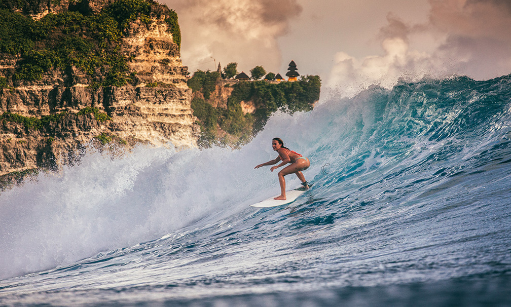 The current is always flowing internally from Temples to Padang Padang and gets stronger the larger the swell. On a medium-sized swell at high tide, returning to the cave’s entrance can be extremely challenging.