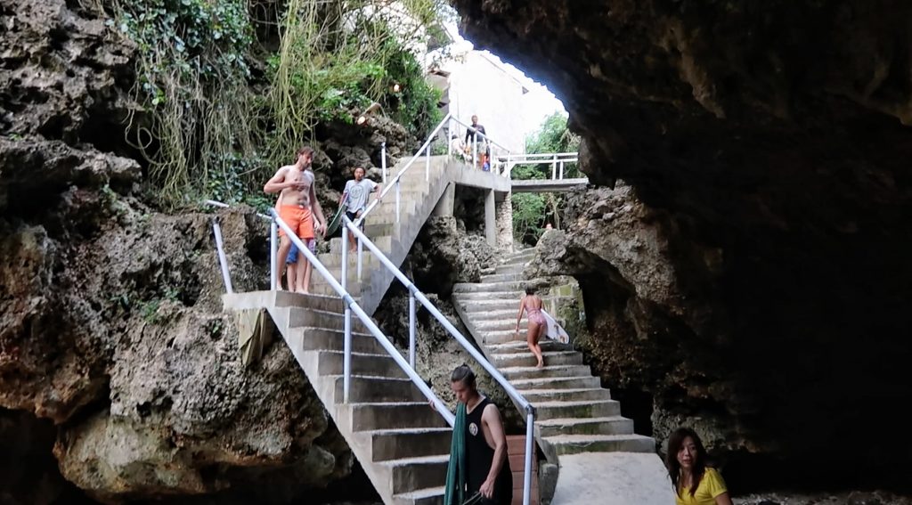 Three distinct staircases now allow access to the cave below, replacing the decrepit ladder that was once there. During the rainy season, a river of water cut off access to the first set of stairs. The second staircase was a bit more terrifying, but it provided you a better chance of making it down the stairs without getting seriously hurt by the water flow. The third staircase offers safe access to the cave every day of the year and is immune to any amount of water coming from above or below. Everyone enters via the cave, but not everyone returns to the starting place because the goat tracks around the temple area are difficult to travel with a surfboard.